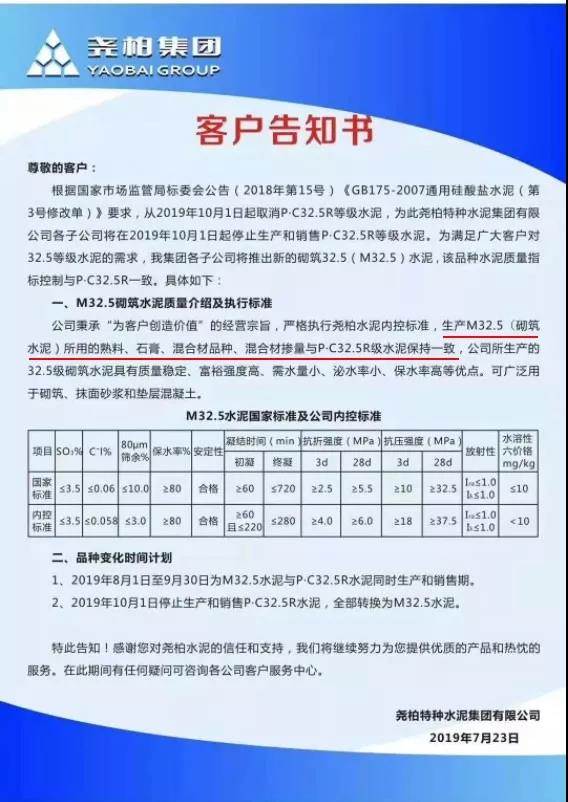尧柏集团客户告知书称,尧柏集团推出的M32.5砌筑水泥质量指标控制与P.C32.5R保持一致。