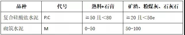 通用硅酸盐水泥按混合材料的品种和掺量分为硅酸盐水泥、普通硅酸盐水泥、矿渣硅酸盐水泥、火山灰质硅酸盐水泥、粉煤灰硅酸盐水泥和复合硅酸盐水泥。其中复合硅酸盐水泥也就是以P.C为代号的水泥品种其熟料+石膏的组分要求为大于等于50%且小于80%。