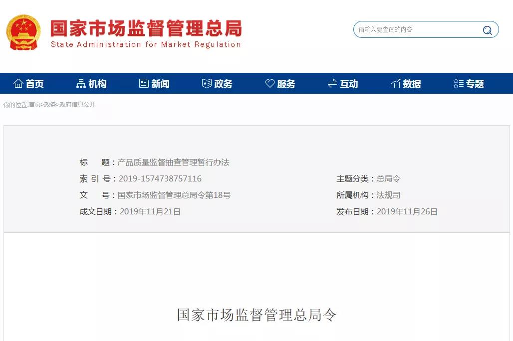 第五十六条 本办法自2020年1月1日起施行。2010年12月29日原国家质量监督检验检疫总局令第133号公布的《产品质量监督抽查管理办法》、2014年2月14日原国家工商行政管理总局令第61号公布的《流通领域商品质量抽查检验办法》、2016年3月17日原国家工商行政管理总局令第85号公布的《流通领域商品质量监督管理办法》同时废止。