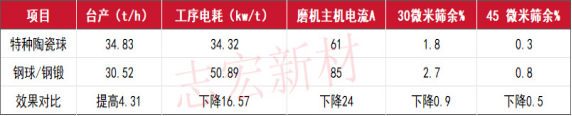 贵州红狮水泥某企业4.6×14.5米磨机二仓原用普通第一代陶瓷球,改用第三代特种陶瓷球后,台产提高30.3t/h,增产幅度10%;粉磨工序电耗降低1.5度/吨,下降幅度6.5%;入库水泥45μm筛余细度降低1.0,比表面积提高9.6。