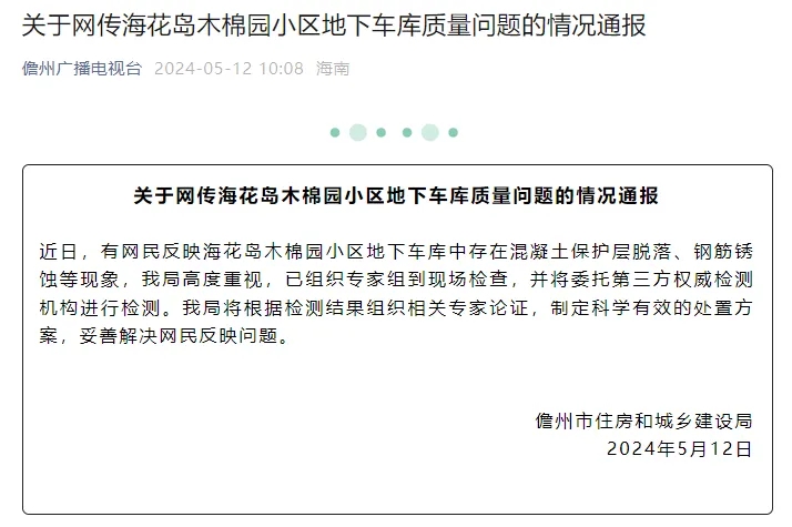 5月12日,海南省儋州市住房和城乡建设局发布《关于网传海花岛木棉园小区地下车库质量问题的情况通报》,表示高度重视网民反映的海花岛木棉园小区地下车库中存在混凝土保护层脱落、钢筋锈蚀等情况,已组织专家组到现场检查,并将委托第三方权威检测机构进行检测,将根据检测结果组织相关专家论证,制定科学有效的处置方案,妥善解决问题。