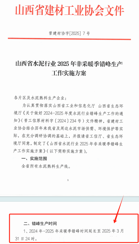 根据山西省建材工业协会《山西省水泥行业2025非采暖季错峰生产工作实施方案》(晋建材字〔2025〕3号),全省水泥熟料企业2024年~2025年采暖季错峰时间延长至2025年3月31日24时。