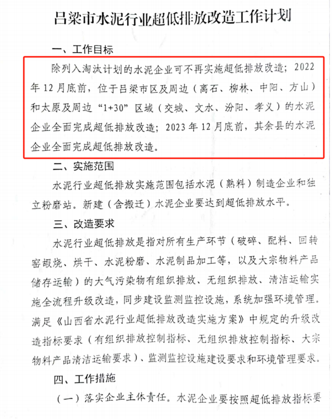 吕梁市生态环境局与工信局更早前联合印发的《吕梁市水泥行业超低排放改造工作计划》(吕环发〔2021〕121号)明确要求,全市水泥企业需在2022年12月底前完成超低排放改造并通过验收。2023年山西省政府办公厅发布的《加强汾河谷地污染治理若干措施》(晋政办发〔2023〕67号)进一步将改造时限放宽至2024年10月。