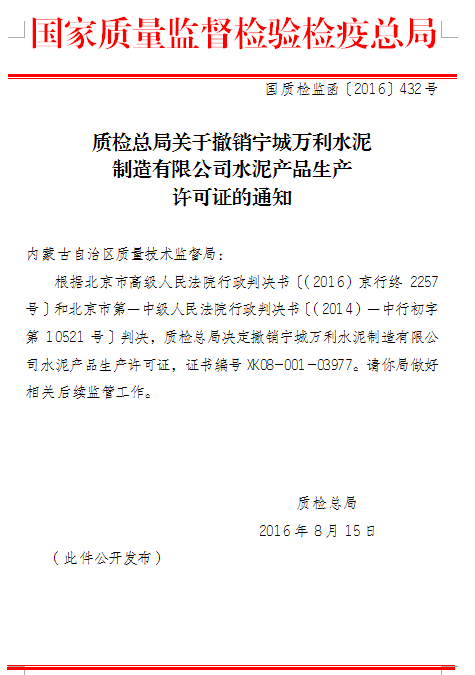 10月14日,质检总局官网发布通知称,根据北京市高级人民法院行政判决书〔(2016)京行终2257号〕和北京市第一中级人民法院行政判决书〔(2014)一中行初字第10521号〕判决,质检总局决定撤销宁城万利水泥制造有限公司水泥产品生产许可证,证书编号XK08-001-03977。