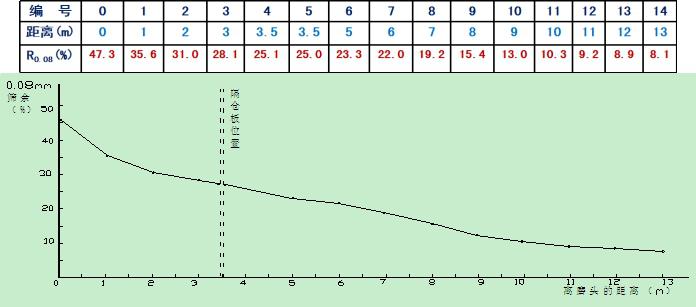 把每个取样点取得的试样混合均匀后,作为该取样点的平均试样并编好号,防止搞错,用0.08mm筛分别进行筛析,测得各段的筛余百分数;然后以纵坐标为测出的筛余%(细度),横坐标为取样点离磨头的距离(m),把筛析数据,标记在坐标图上、联线,即为磨内筛析曲线。