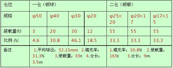 (2)参考同类企业生产数据:一仓钢球装载量60吨、二仓钢锻装载量170吨。