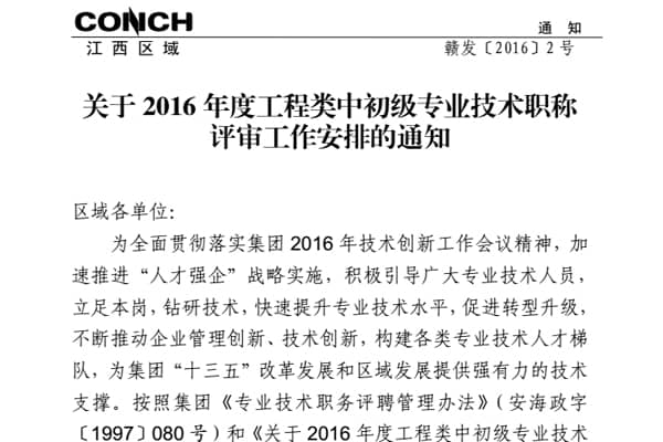 为全面贯彻落实集团2016年技术创新工作会议精神,加速推进“人才强企”战略实施,积极引导广大专业技术人员,立足本岗,钻研技术,快速提升专业技术水平,促进转型升级,不断推动企业管理创新、技术创新,构建各类专业技术人才梯队,为集团“十三五”改革发展和区域发展提供强有力的技术支撑,按照集团《专业技术职务评聘管理办法》和《关于2016年度工程类中初级专业技术职称评审工作安排的通知》要求,为切实做好江西区域2016年工程类中、初级专业技术资格职称评审工作,区域行政人事专业组牵头下发了《江西区域2016年度工程类中初级专业技术职称评审工作安排的通知》。