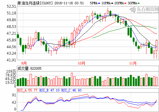 截止收盘,美国WTI原油12月期货涨5.75%,报45.81美元/桶。布伦特原油1月期货涨5.67%,报46.95美元/桶。