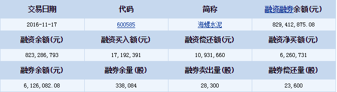 海螺水泥(600585)2016-11-17融资融券信息显示,海螺水泥融资余额823,286,793元,融券余额6,126,082.08元,融资买入额17,192,391元,融资偿还额10,931,660元,融资净买额6,260,731元,融券余量338,084股,融券卖出量28,300股,融券偿还量23,600股,融资融券余额829,412,875.08元。海螺水泥融资融券详细信息如下表: