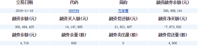 万年青(000789)2016-11-18融资融券信息显示,万年青融资余额300,494,425元,融券余额4,716元,融资买入额14,147,905元,融资偿还额21,821,407元,融资净买额-7,673,502元,融券余量600股,融券卖出量0股,融券偿还量4,800股,融资融券余额300,499,141元。万年青融资融券详细信息如下表: