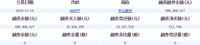 天山股份(000877)2016-11-18融资融券信息显示,天山股份融资余额586,909,017元,融券余额0元,融资买入额15,939,259元,融资偿还额15,427,510元,融资净买额511,749元,融券余量0股,融券卖出量0股,融券偿还量0股,融资融券余额586,909,017元。天山股份融资融券详细信息如下表: