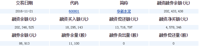 华新水泥(600801)2016-11-21融资融券信息显示,华新水泥融资余额202,346,525元,融券余额86,913元,融资买入额18,295,143元,融资偿还额13,716,797元,融资净买额4,578,346元,融券余量11,100股,融券卖出量0股,融券偿还量0股,融资融券余额202,433,438元。华新水泥融资融券详细信息如下表:
