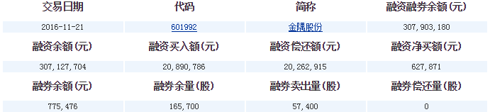 金隅股份(601992)2016-11-21融资融券信息显示,金隅股份融资余额307,127,704元,融券余额775,476元,融资买入额20,890,786元,融资偿还额20,262,915元,融资净买额627,871元,融券余量165,700股,融券卖出量57,400股,融券偿还量0股,融资融券余额307,903,180元。金隅股份融资融券详细信息如下表: