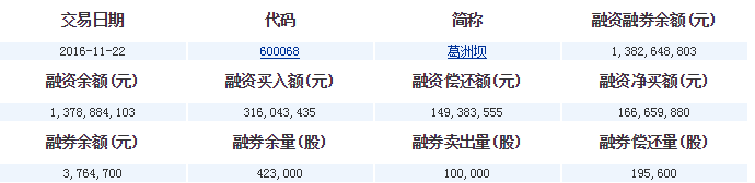 葛洲坝(600068)2016-11-22融资融券信息显示,葛洲坝融资余额1,378,884,103元,融券余额3,764,700元,融资买入额316,043,435元,融资偿还额149,383,555元,融资净买额166,659,880元,融券余量423,000股,融券卖出量100,000股,融券偿还量195,600股,融资融券余额1,382,648,803元。葛洲坝融资融券详细信息如下表: