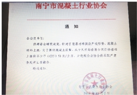 记者看到,南宁市混凝土行业协会发给会员单位的通知称,经理事会研究决定,针对目前原材料供应严峻形势,混凝土材料上涨,为了保证混凝土质量,从12月5日开始,在原合同价格基础上涨价不少于(C25,混凝土的强度等级)50元/立方米,“对违规企业,协会将采取严肃查处并汇报散办”。该通知还明确“抄报南宁市散装水泥办公室”。