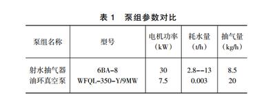 原射水抽汽系统动力设备是两台射水泵电动机,一用一备。现在新安装的油环真空泵组动力设备是两台真空泵电动机,一用一备。所以节电效益就是两种泵电动机功率对比。参数对比见表1。