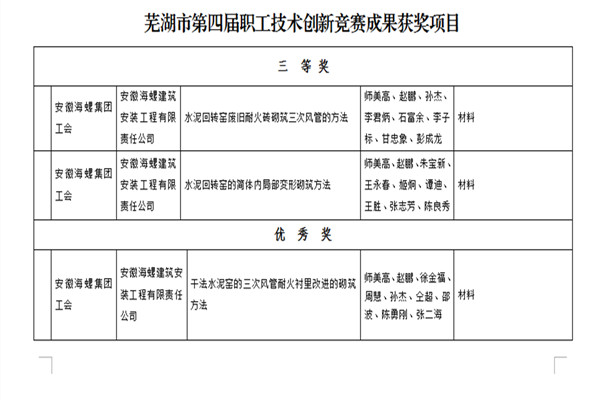 近日,芜湖市总工会、芜湖市科学技术局、芜湖市发明协会等三家单位联合组织开展了职工技术创新竞赛活动,海螺建安公司首次参加此项活动,申报三个项目全部获奖。