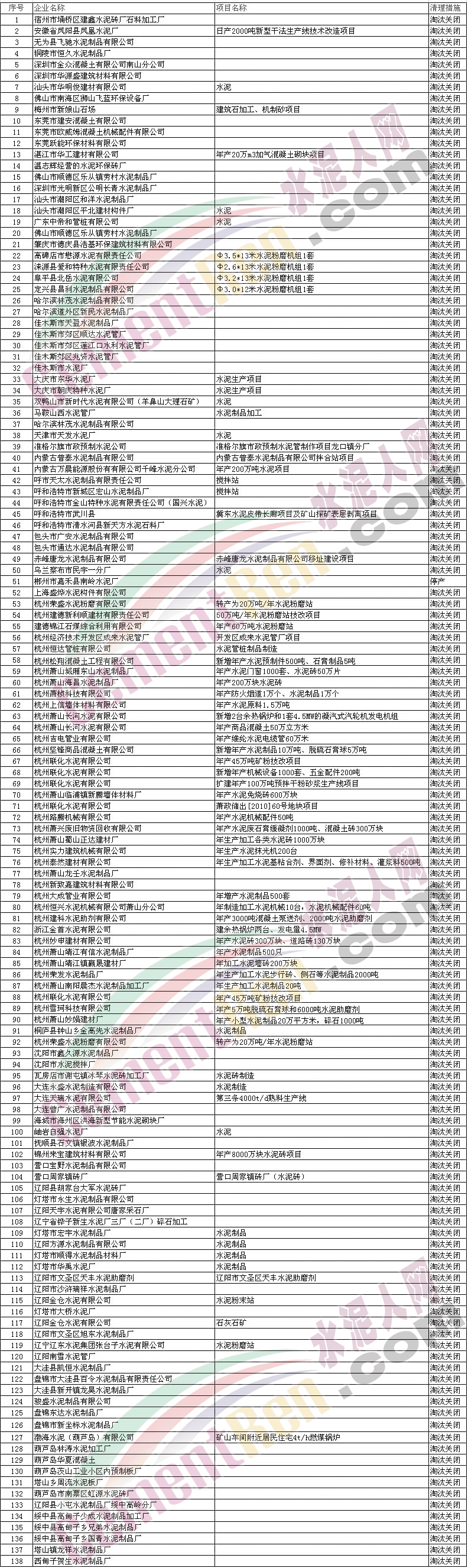 为增加行业信息的透明性,方便大家在选择客户与供应商时作为参考,也为方便大家,如果与被淘汰关闭的企业或项目有业务来往,能提前做出应对措施。水泥人网统计出广东、上海、天津、安徽、辽宁等地区水泥企业及项目淘汰关闭共138家,附名单如下: