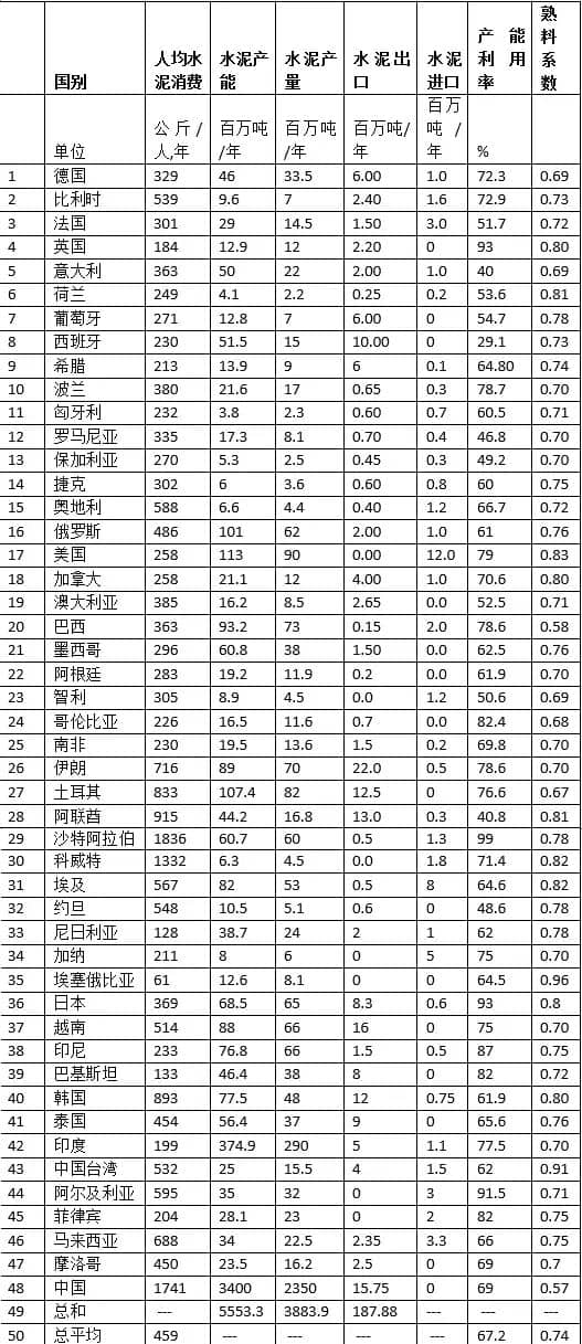 表1 世界主要国家(地区)水泥产能利用率及其熟料系数汇总图