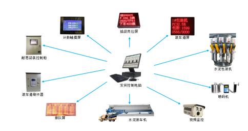 耐思袋装水泥智能发货控制系统由上位机中控系统、包装机、装车机、喷码机、计数系统、自动挡包装置、自动扳道装置、PLC控制系统、装车道刷卡终端、LED指示系统、声光报警系统、视频监控系统、数据传输系统组成。