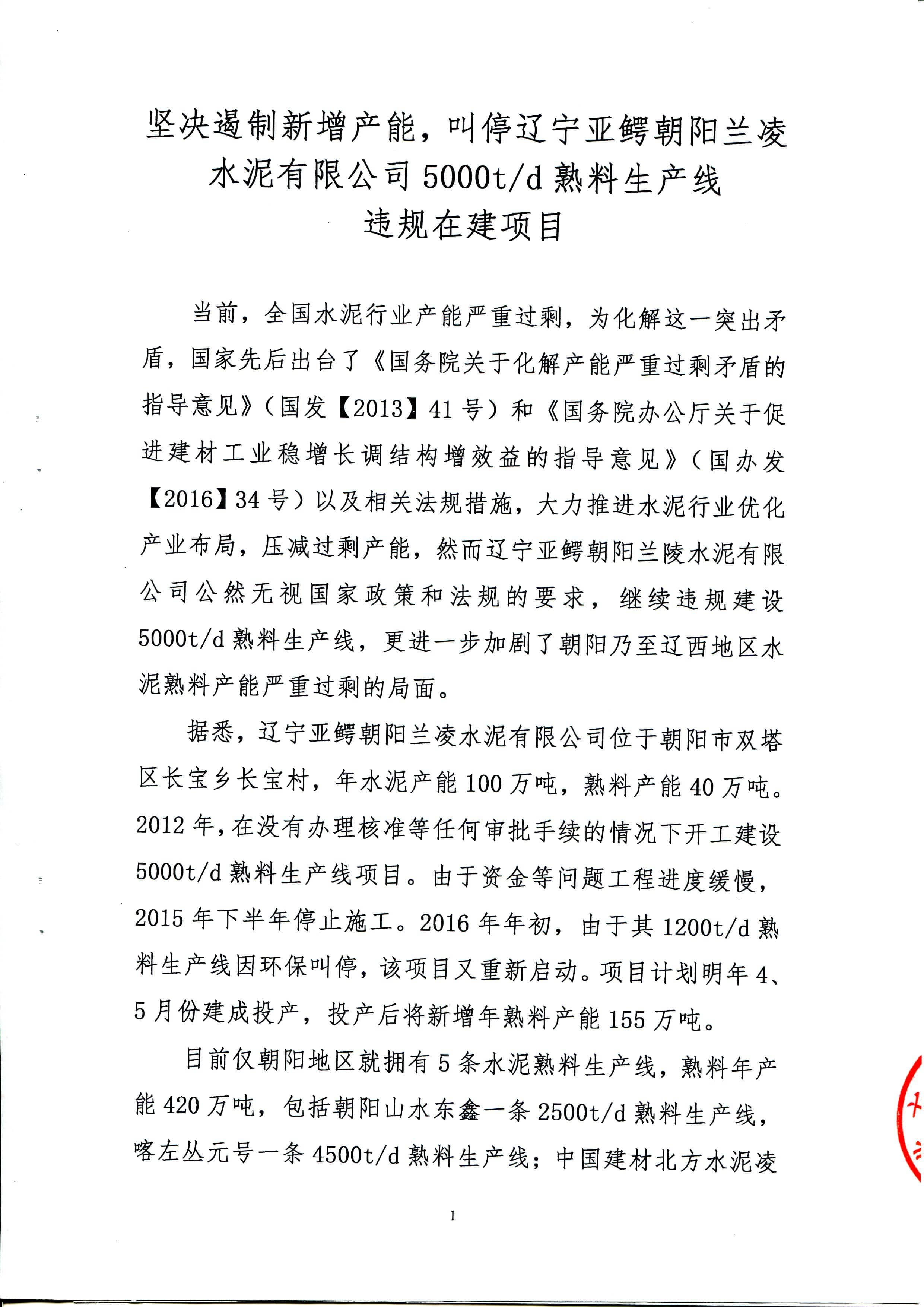 近日,有网友向水泥人网爆料,辽宁亚鳄朝阳兰凌水泥有限公司5000t/d熟料生产线违规建线,和其它举报不一样的是,本次举报是由山水水泥、北方水泥、三鸽水泥、辽宁建材协会联名举报,举报材料如下:
