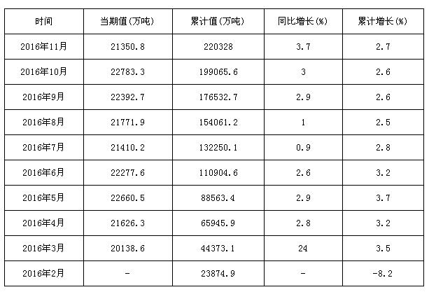 今年以来,我国水泥产量一扫颓势,自今年3月起,水泥产量持续增长,出现微弱复苏态势。各月累计同比增速虽然呈现逐月放缓态势,但基本保持在2~3.5%以内运行,截止11月份产量累计22.03亿吨,同比增长2.7%,从绝对量上看,达到历年同期次高水平,与2014年同期的历史最高点相比,仅差0.69亿吨。