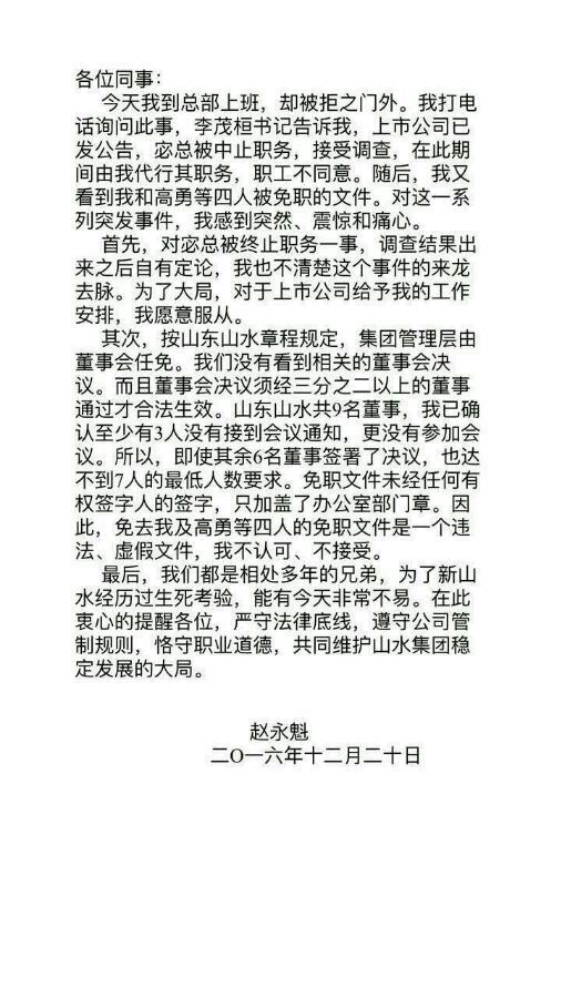 天瑞集团控股山水水泥后,新山水水泥明显出现了以老一派维权宓敬田为代表的派系与以天瑞高管为代表的山水水泥“新董事会”的争斗,其内部派系争斗非常强烈。去年12月19日山水水泥上市公司发出公告,宓敬田因言论失职暂时免职,由赵永魁代其职,然而该公告很快又被撤销,取而代之的是一份对赵永魁、高勇、刘德权、赵彬的免职文件,免职理由是严重违反集团基本政治纪律,破坏山水集团稳定发展的大局,影响恶劣。