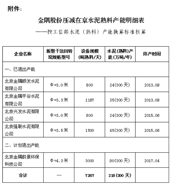 附件:金隅股份压减在京水泥熟料产能明细表