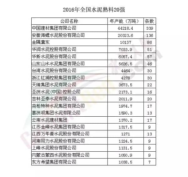2016年是“十三五”的开局之年,也是供给侧改革的元年,在这一年里,全国水泥价格开始触底反弹,西藏水泥价格一度上涨至800元/吨左右,水泥市场价格上涨也使得很多企业2016年的业绩报表比较好看。但是随着混合所有制的逐步推进,国企、央企之间的兼并重组,使国内水泥行业的产能布局发生了很大的变化。据水泥人网统计,2016年全国水泥熟料前20强企业熟料产能为12.1966亿吨,水泥熟料生产线为944条。
