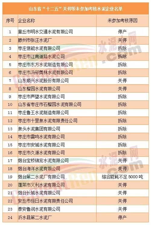 据统计,“十二五”山东省列入国家万家企业节能低碳行动的水泥企业总共74家,除24家因关停等原因未考核外,实际考核50家。其中,超额完成31家,占62%;完成19家,占38%。24家未考核的水泥企业,原因有停产、关停、拆除、产能不足等,其中停产2家,占8.3%;关停9家,占37.5%;拆除12家,占50%;综合能耗不足5000吨1家,占4.2%;关停企业名单列表如下: