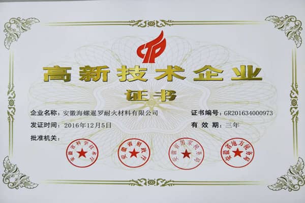 为积极争取国家相关优惠政策、实现公司效益最大化,进一步提升企业的美誉度和市场竞争力,并以高新技术企业的申报为契机,进一步推进公司技术研发和管理创新工作、提升公司的综合竞争力,耐火材料公司积极开展高新技术企业申报工作,于2016年12月顺利通过国家高新技术企业认定,并于2017年元月取得高新技术企业证书,成为安徽省2016年第二批高新技术企业,这是耐火材料发展史上的又一里程碑。