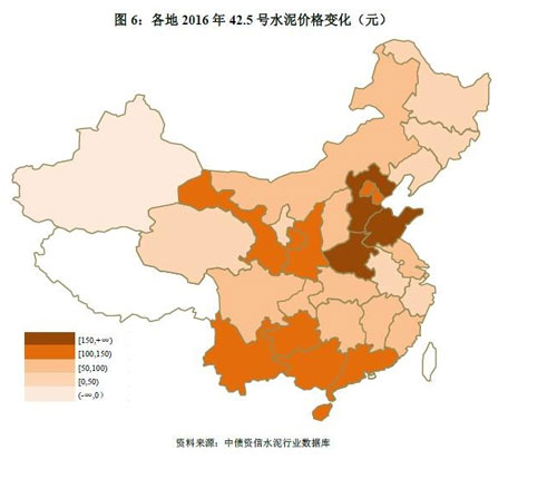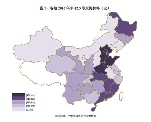 华北地区由于基数较低,得益于京津冀地区需求回暖、金隅冀东整合带来竞争秩序改善等因素,全年42.5号水泥价格涨幅117元,居全国首位,价格水平亦从2015年末全国末尾攀升至第二位;东北地区往年在黑龙江、吉林良好竞争秩序支撑下价格处全国高位,但2016年在需求低迷背景下价格涨幅较小,截至2016年末价格已处倒数第二位。