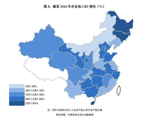 分区域看,两湖、长三角等地区较好的竞争秩序和主导企业间相对成熟的竞争策略利于区域价格维持合理水平;东北地区黑吉两省集中度虽较高,但脱离需求基础的协同效果已逐渐趋弱,正如上文所提,2016年东北地区水泥价格涨幅全国垫底;山西和内蒙是全国水泥区域产能集中度最低的两个省份,区域内尚未形成具有明显优势的龙头企业,低迷的需求叠加较差的竞争秩序对未来区域价格走势形成制约。