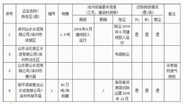 山东省滨州市落实《山东省区域性大气污染物综合排放标准》2016年12月份执行情况“双晒”清单已经公布。其中含四家水泥企业: 1 滨州山水水泥有限公司 2 山东沾化崇正水泥有限公司 3 山东泰山水泥有限公司 4 邹平梁邹青龙山水泥有限公司