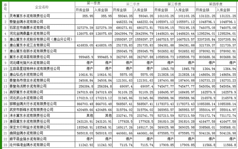 河北省国家重点监控企业2016年度排污费公示涉及二十三家水泥企业,除河北曙光强兴水泥有限公司、顺平县金强水泥有限公司两家全年停产及唐山弘也水泥有限公司一二季度停产,涞水冀东水泥有限责任公司一二季度未涉及外,其余19家全年都有征收。 附:河北省国家重点监控企业2016年度排污费公示(23家水泥企业)