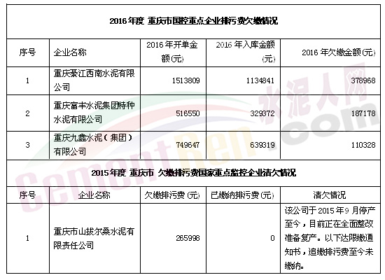 (见下表),其中重庆綦江西南水泥有限公司2016年欠缴378968元,属欠费金额最大的水泥企业。而重庆市山拔尔桑水泥有限责任公司,至2015年开始一直拖欠排污费265998元至今,属拖欠时间较长的水泥企业。