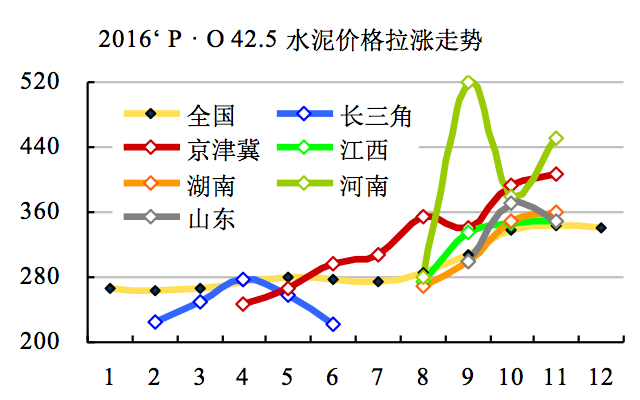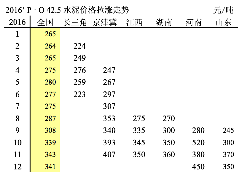 2013年需求是拉动价格上涨主因,2016年需求面是止跌反弹,谈不上市场有多好。价格反弹力度如此之大,重要原因:2015年市场快速下行,价格更是拦腰截断,当年跌去58元/吨。行业对市场认识趋同,一致大于分歧。2016年前后大企业重组,其目的就是共同应对市场(量价)下行。今年在长三角打响第一枪,就看到价格反弹的力度和信心,其后是各地区一波推一波的价格恢复性上涨。京津冀市场价格从5月持续走高,一直贯穿全年,其他地区抓住机会,果断推涨是今年热点。只是今年价格推涨主力易手:京津冀、河南、山东成为主角,这都是传统低价区。应该说今年价格推涨是行业市场维护力量在主导。