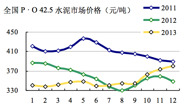 2010年,处于市场高峰期,当年水泥产量增长15.5%,年末为完成节能排放指标,全国一刀切拉闸限电,年末价格推涨到435元/吨,年内涨幅62元/吨;