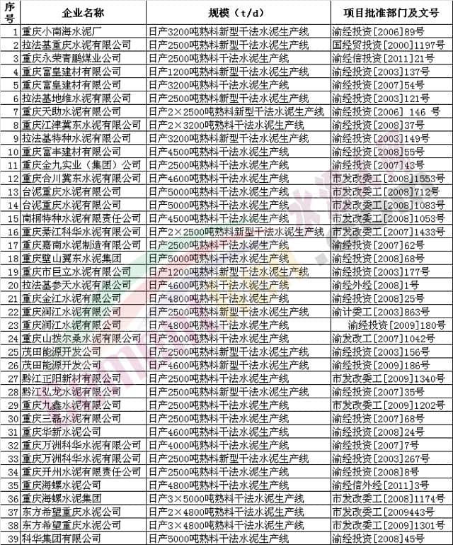 近期重庆市经信委公布了市属水泥行业企业建设项目名单,共公布33家水泥企业,均不属于落后产能。 原文: 重庆市经济和信息化委员会关于重庆市水泥、平板玻璃行业企业建设项目库的公示 按照国家环境保护部《关于印发水泥玻璃行业淘汰落后产能专项督查方案的通知》(环明传【2017】1号)的有关要求,现将我市水泥、平板玻璃行业企业建设项目库予以公示。 附件:重庆市水泥行业企业建设项目库名单 重庆市经济和信息化委员会 2017年2月13日 附:重庆市水泥行业企业建设项目库名单