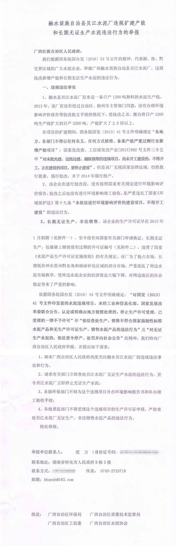 近日,湖南怀化市水泥协会联合部分水泥企业向中国建筑材料联合会提交的举报材料称,广西融水苗族自治县贝江水泥厂,涉嫌违规技改新增产能和长期无证生产水泥。