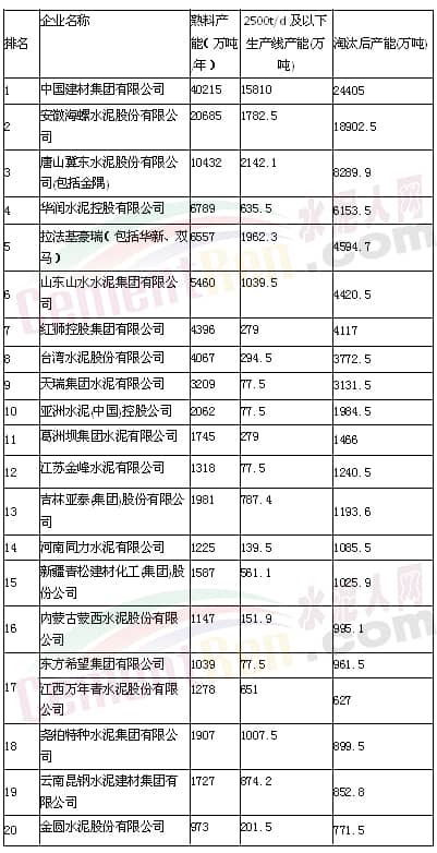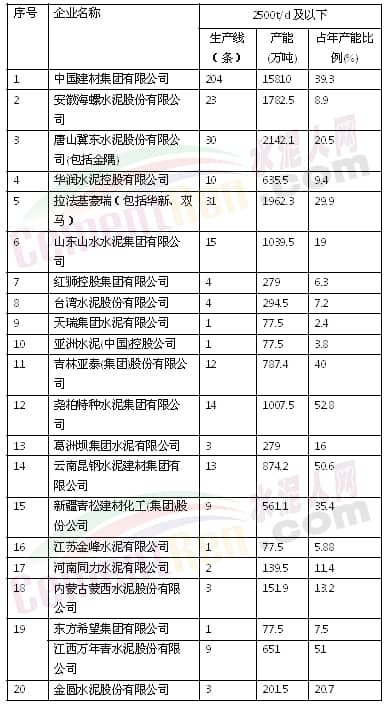 表3:淘汰2500t/d及以下生产线20强企业产能排名榜