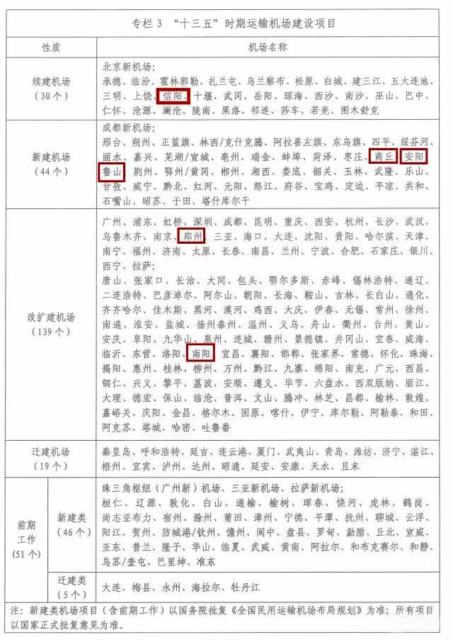 在《规划》“十三五”时期运输机场建设项目的表格中,续建机场项目有30个,其中包括信阳市续建机场项目;新建机场项目44个,其中包括河南省商丘、安阳、鲁山新建机场项目;改扩建机场项目达到139个,其中包括河南省郑州市、南阳市改扩建机场项目。