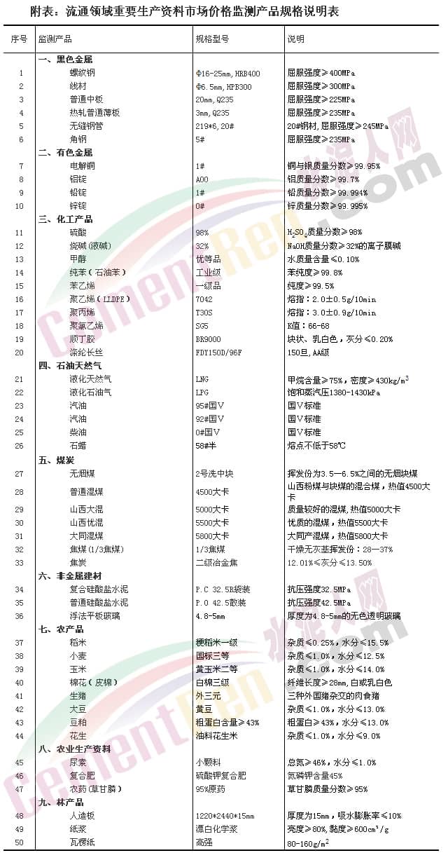 流通领域重要生产资料市场价格监测内容包括9大类50种产品的价格。类别与产品规格说明详见附表。