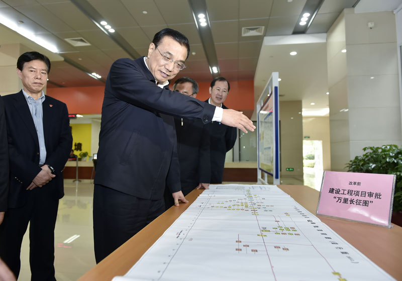 图片说明:“这些多余的审批项目都该‘打叉’!把它送进历史。”2015年1月5日,李克强在广东自贸区南沙片区,指着一张长4米、耗时近800天的投资项目审批流程图说。得知改革后审批时间缩短为原来的1/5,总理说,“万里审批图”制约市场活力,容易滋生腐败。广东要继续先行先试,为“三规合一”等改革探路。