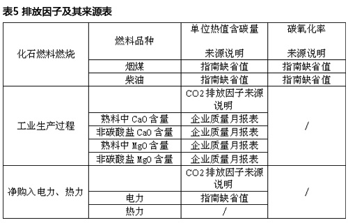 水泥企业涉及到的所有排放因子种类及来源详见表5。