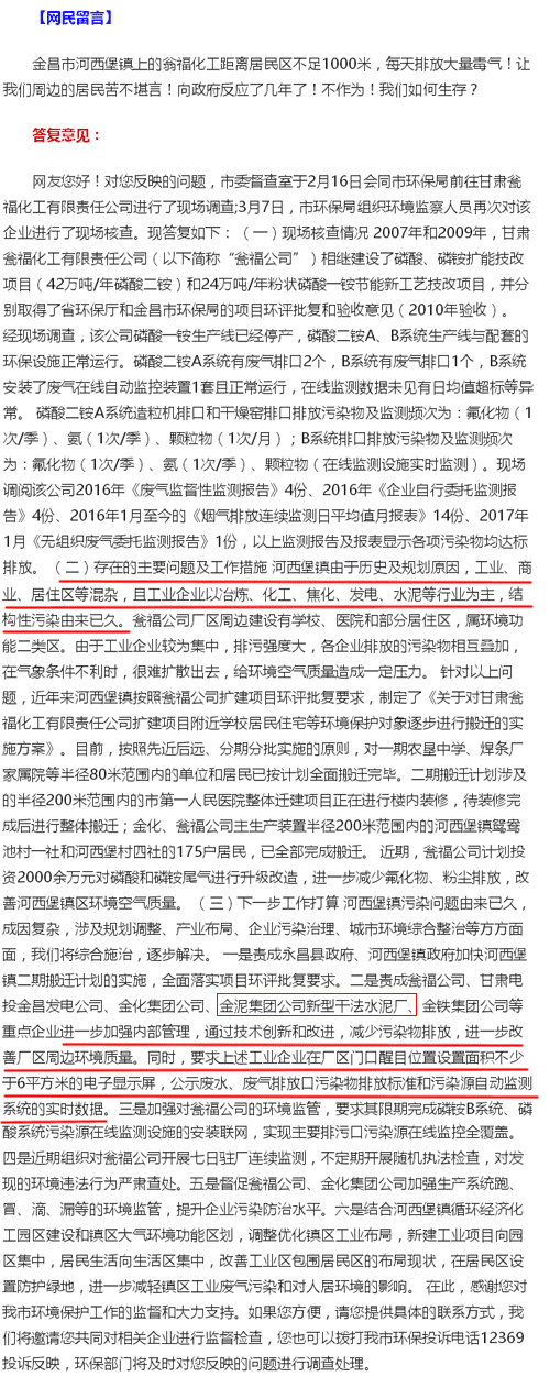 官方回复中提到了当地的水泥企业——金泥集团公司新型干法水泥厂,要求企业进一步加强内部管理,通过技术创新和改进,减少污染物排放,进一步改善厂区周边环境质量。同时,要求企业在厂区门口醒目位置设置面积不少于6平方米的电子显示屏,公示废水、废气排放口污染物排放标准和污染源自动监测系统的实时数据。 ”,由此可见当地政府治理污染的决心和力度。