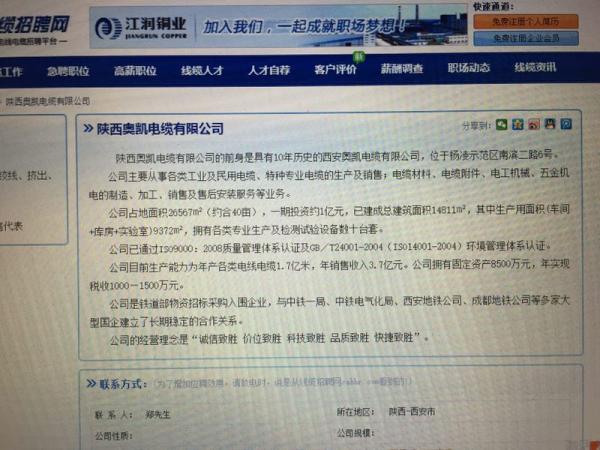 行业网站“线缆招聘网”上的一则招聘信息称,陕西奥凯公司的前身是西安奥凯公司。