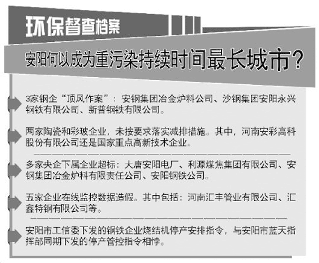 安钢集团冶金炉料公司在安阳市启动一级重污染天气严格管控情况下,夜间污染物排放量明显增大,存在超排现象;沙钢集团安阳永兴钢铁有限公司的重污染天气应急管控预案中I级响应措施未达到50%的限产要求;安阳新南亚陶瓷有限公司未按要求落实减排措施;河南安彩高科股份有限公司重污染天气应急管控限产措施没有具体到生产车间和一线工段,无投料、产量的量化指标,未严格落实30%的限产措施;新普钢铁有限公司2月6日未严格执行安阳市蓝天工程指挥部管控停产通知要求,正常生产。
