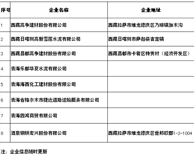 目前,已有6家区内外水泥、钢材、民爆品企业有意向参与重点项目建材需求对接(详见附件),现将各重点项目单位联系人、联系方式和区内外水泥、钢材、民爆品企业在藏地址、联络人和联络方式,在西藏自治区发展改革委、西藏自治区工业和信息化厅、西藏自治区住房和城乡建设厅网站上予以公布,各重点项目建设单位可与建材生产、经销商自行对接,也可自行联系其它供货企业,订货结果必须于3月10日前报自治区重点办。