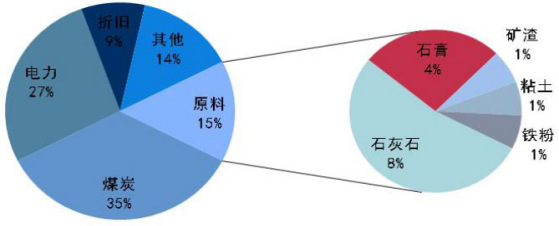 其次,产能的开关成本及生产成本相对较低。从近几年价格出现大幅波动的原因不难看出一点,产能的发挥程度直接导致价格波动的大小。16年底至17年初,由于环保检查要求严格、错峰停产政策落实到位,地区水泥、熟料供给趋紧,导致水泥价格坚挺、熟料价格一度出现淡季上涨的情况。如河南部分地区16年8月份开始的环保整治和错峰停产,力度从产能发挥控制50%以内到全面停产,导致P.O42.5散装价格从260元/吨飙升至最高450元吨,最高单次涨幅高达惊人的100元/吨。另一方面水泥、熟料的生产成本相对较低,该属性决定了其产能相对可控。17年2月份指数提前出现上涨也是因为华东地区大范围30-45天的错峰停产导致。从水泥的生产成本上来看,主要的成本集中在煤炭和电力上,两者相加约占总成本的62%,因此以上两者的价格波动也影响水泥的价格调整。
